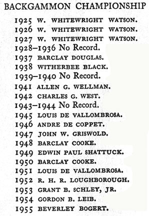 | Racquet & Tennis Club (New York City) list of Backgammon Champions: 1925-1955 (From Racquet & Tennis Club 1956 Club Book): | ||||||||||||||||||||||||||||||||||||||