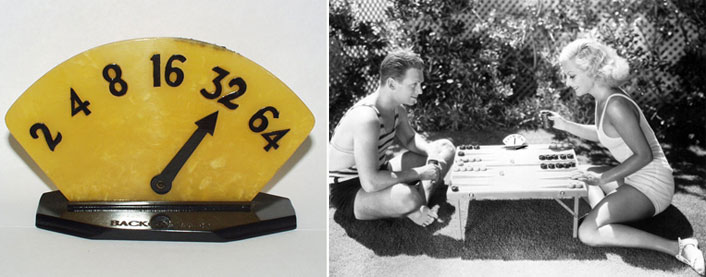 | (L) Scoring dial owned by Chris Bray. (R) Douglas Fairbanks, Jr. and Joan Crawford at their home in 1931 using a scoring dial to keep track of backgammon doubling. | ||||||||||||||||||||||||||||||||||||||