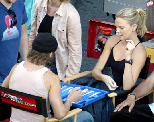 | CHARLIZE THERON takes a break during filming of The Italian Job (2003) for a game of backgammon. | ||||||||||||||||